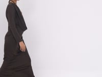 Elevate your evening elegance with this captivating deep plum full-length gown, a design that seamlessly blends sensuality with sophistication. Crafted with a body-contouring silhouette, this gown is ideal for highlighting curves while maintaining graceful fluidity.The front showcases a dramatic draped neckline that reveals a structured inner bustier-style detail, accentuated by a central gold accessory, a bold statement piece that draws the eye and adds regal charm. Long fitted sleeves balance the neckline, while the cinched waist enhances the natural hourglass shape.From the back, the gown features a clean and minimal look with a delicate tie detail at the nape and a back slit at the hem, offering both ease of movement and a touch of allure.