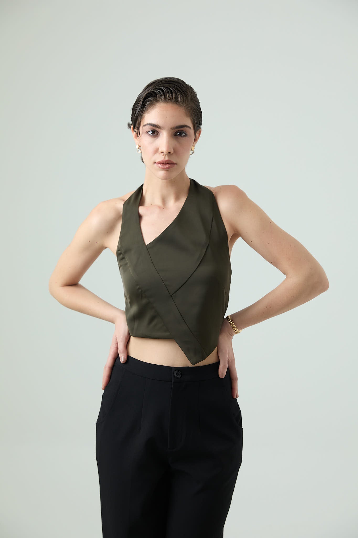The crossover neckline creates a gentle horizontal line that subtly broadens the shoulders.