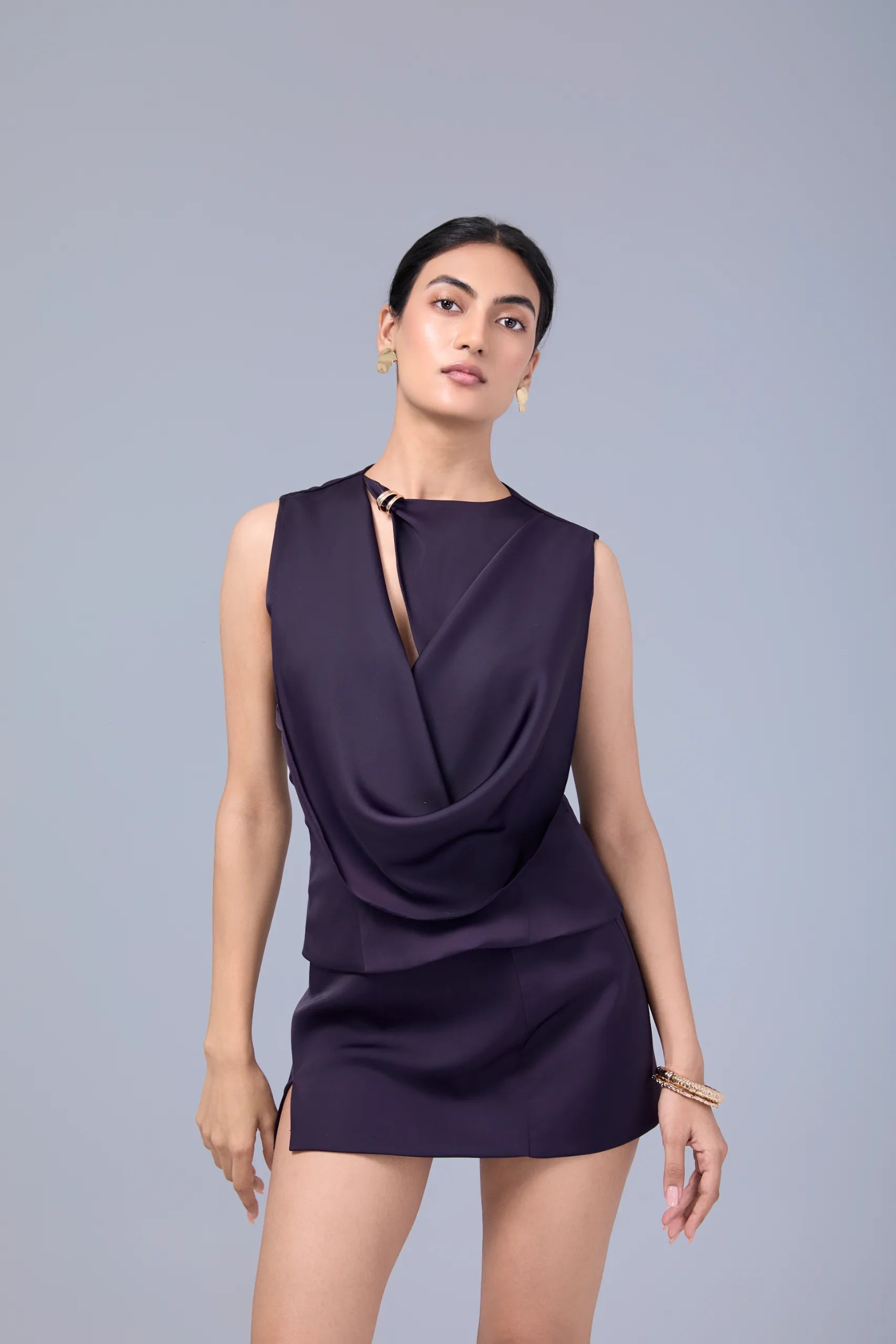 Elevate your evening look with an Elénora cowl top blending sophistication with a bold, modern edge. The draped cowl-front top features an asymmetric keyhole neckline for a touch of allure, perfectly also detailed metal embellishment on neck