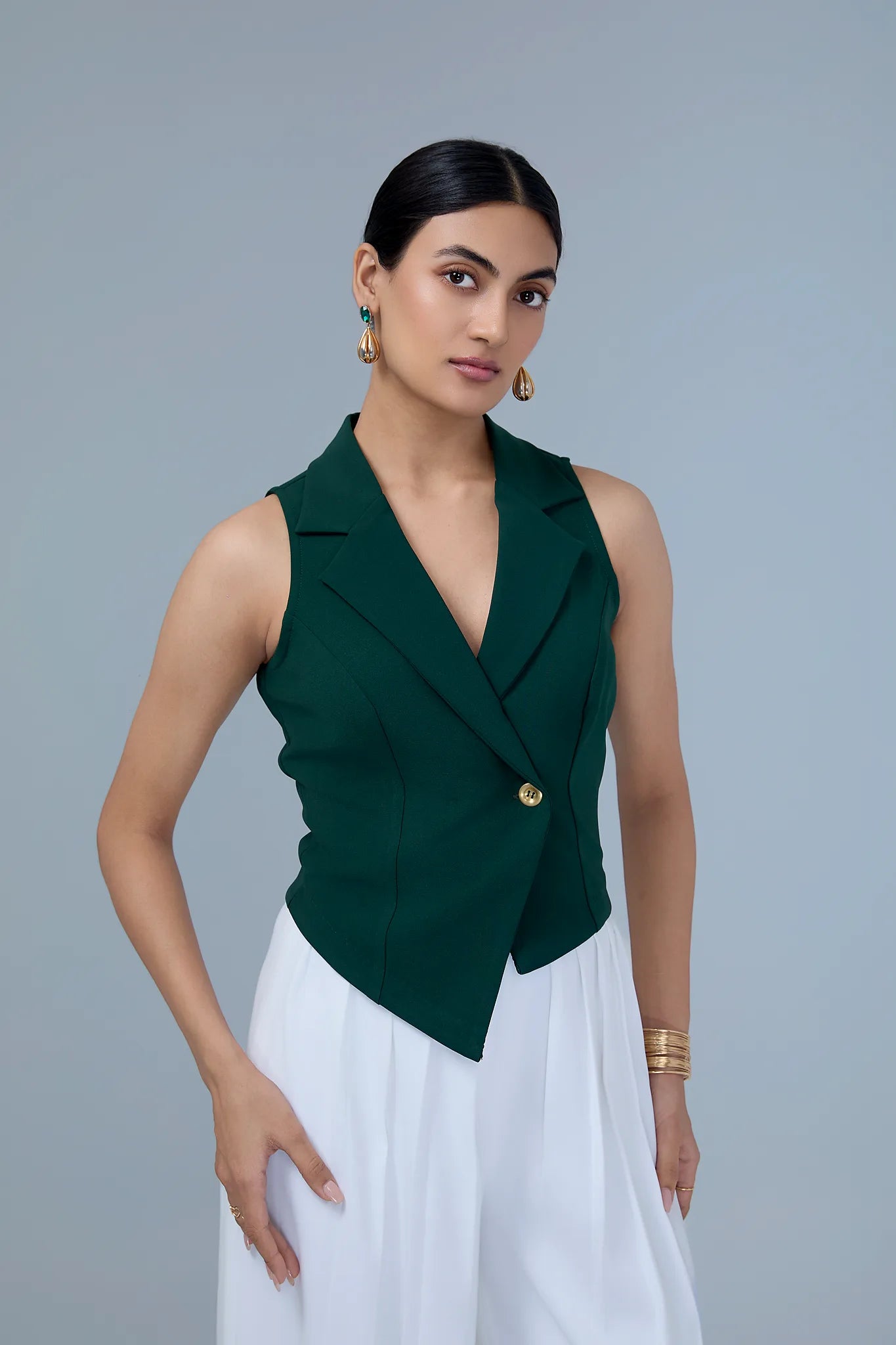 A modern power look with timeless appeal, this structured Elaris vest top and pleated trousers set redefines minimal sophistication. The tailored vest features a sharp notch lapel, single gold-button closure, and angled hemline, creating a flattering hourglass illusion perfect for enhancing the Rectangle body type.Paired with high-waisted, wide-leg trousers, the look flows effortlessly, balancing structure with softness. The crisp contrast of green and white adds freshness, making it ideal for brunches, work events, or polished evenings out.
