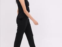 The sleeveless vest top features a deep V-neckline and a sharp asymmetric hem, accentuated by a single gold-button closure that draws the eye to the waist subtly enhancing the Rectangle body shape with graceful definition.
