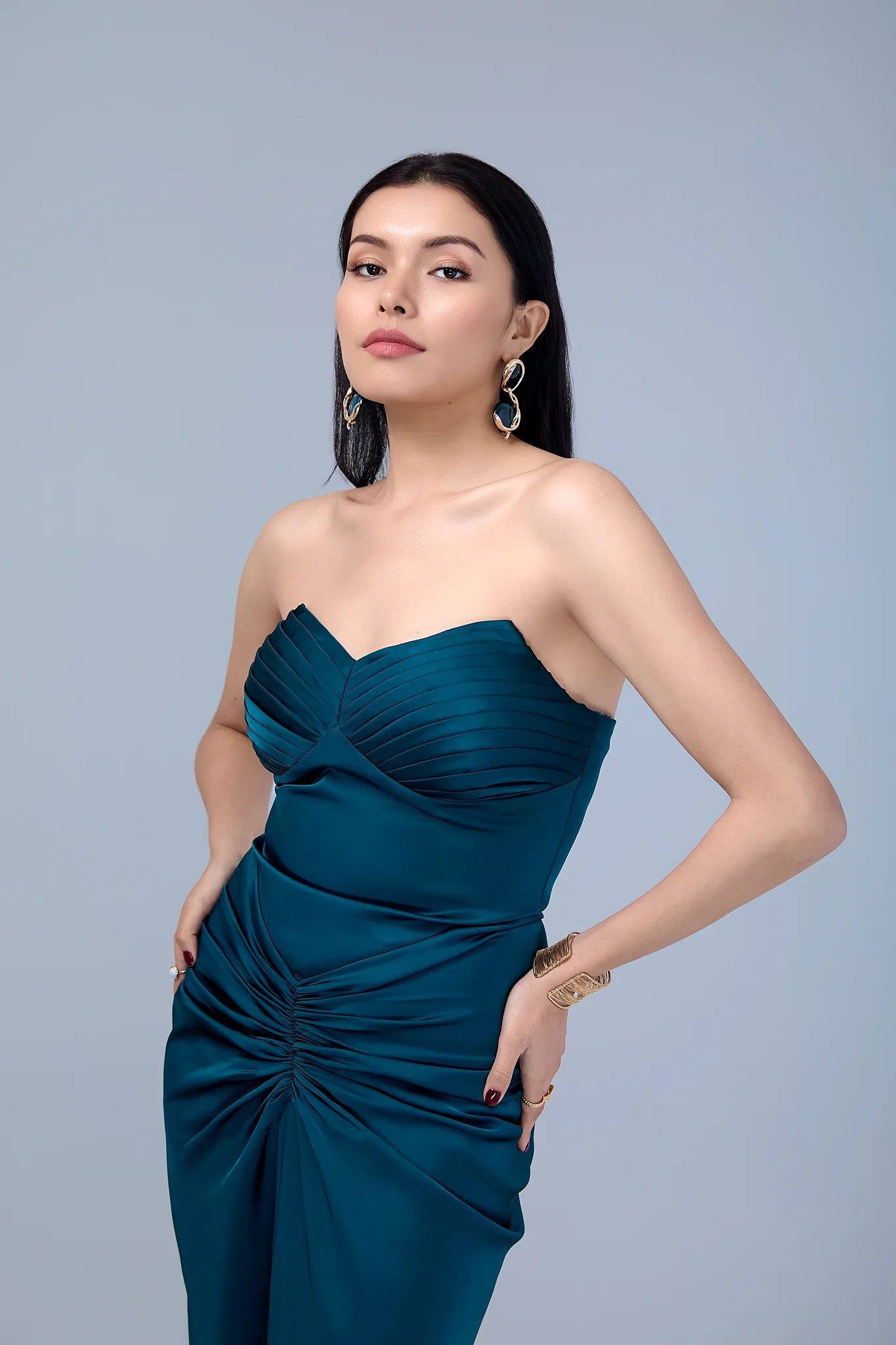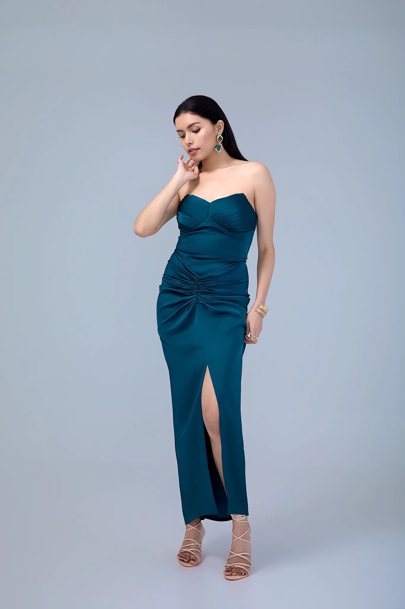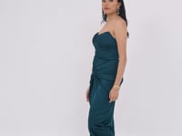 Designed to celebrate feminine grace, this gown beautifully balances structure and fluidity. The pleated bust cups and fitted bodice, adorned with delicate string embellishments, draw the eye upward, adding subtle glamour to the solid hue. Soft gathers at the hips create gentle volume, while a front slit elongates the frame perfectly enhancing a petite pear-shaped silhouette.