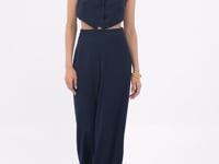 Step into elegance with our Vionté Jumpsuit, a bold yet refined statement piece perfect for evening soirées or upscale events. This sleeveless jumpsuit features a structured halter neckline that gracefully accentuates the shoulders and neckline. The deep V-front is artfully gathered and cinched at the center with a sleek circular cut-out detail, creating a flattering hourglass illusion.The high waistband defines the waistline while a subtle cut-out beneath the bust adds a modern touch of allure. Flowing into dramatic wide-leg trousers, the design offers movement and sophistication with every step. From the back, the high halter collar continues the polished silhouette, balanced by an open mid-back cut-out and seamless lines.
