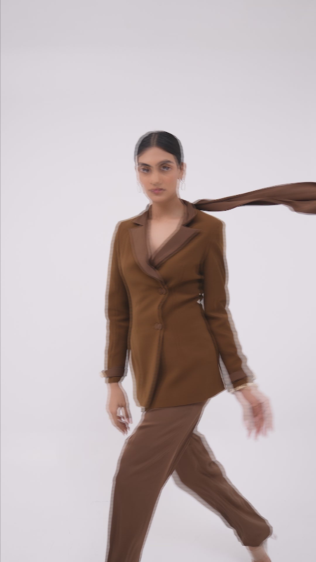 The cowl neckline gently frames the collarbones, adding soft elegance. Its draped effect creates a refined focal point at the upper body. The neck tie enhances interest while introducing a touch of sophistication. This detail draws attention upward, balancing overall proportions. The asymmetrical belt breaks the waistline visually, defining the midsection. Its diagonal placement creates the illusion of a narrower waist. The straight-fit skirt offers clean structure and balanced proportions. Its streamlined silhouette tempers the upper-body detailing effectively. The asymmetry adds movement and a modern design edge. Together, the elements create a polished, well-balanced and flattering look. It softens the overall structure with a graceful, delicate finish. Overall, the ensemble blends elegance with modern shaping techniques.